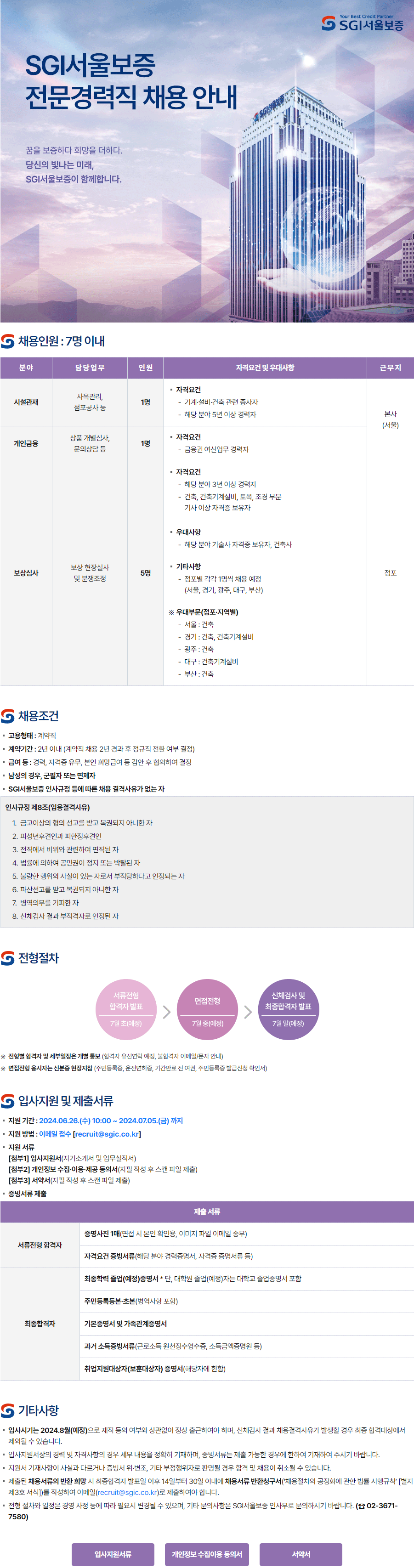 - 전형 절차와 일정은 경영 사정 등에 따라 필요시 변경될 수 있으며, 기타 문의사항은 SGI서울보증 인사부로 문의하시기 바랍니다. (☎ 02-3671-7580)
