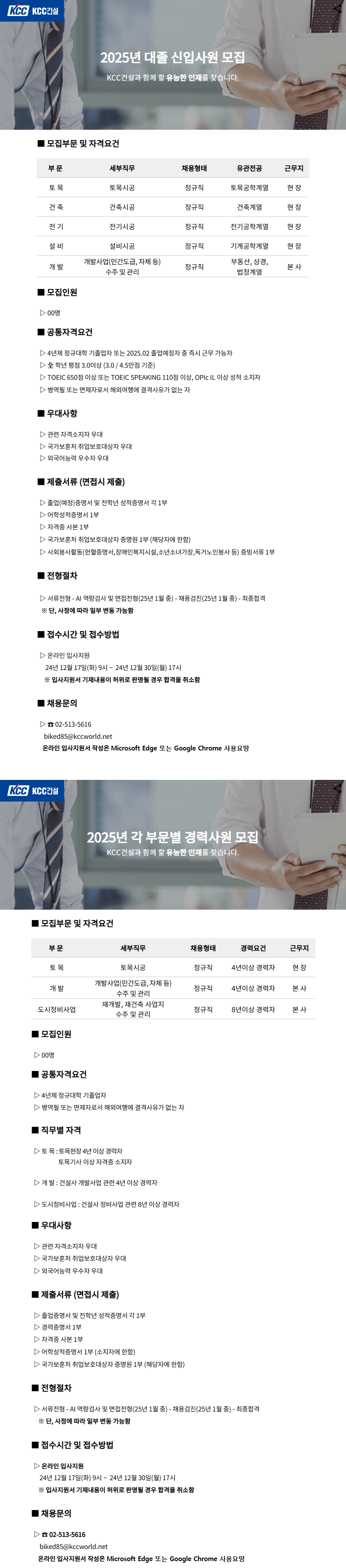 👉 KCC건설, 2025년 대졸신입 및 경력사원 채용 건설워커 원문 주소(url)