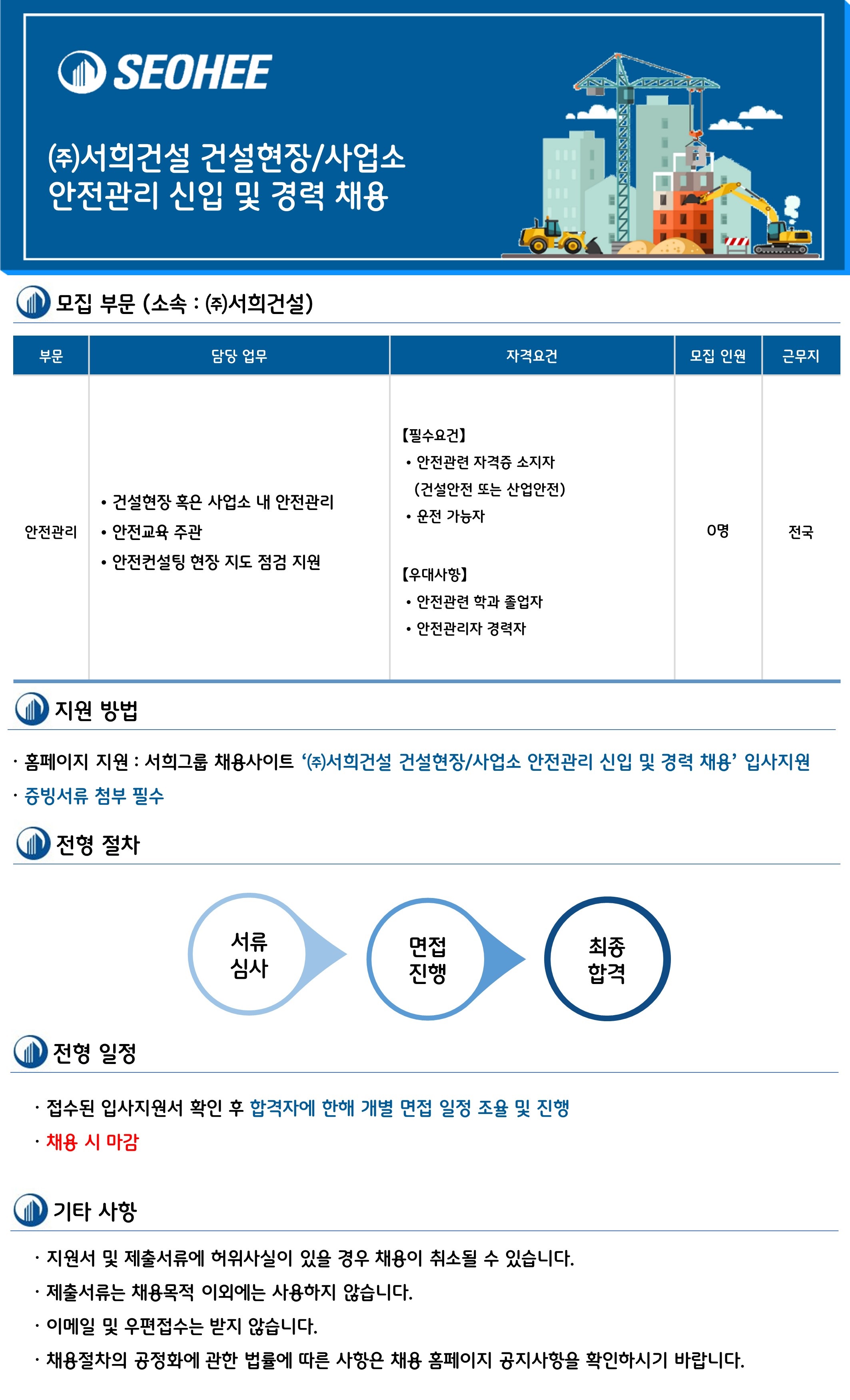 ㆍ홈페이지 지원 : 서희그룹 채용사이트 '(주)서희건설 건설현장/사업소 안전관리 신입 및 경력 채용' 입사지원
