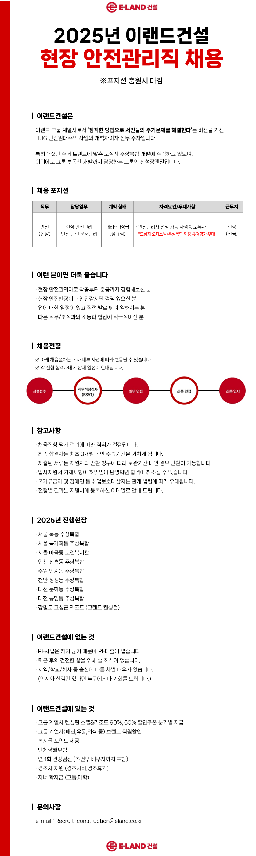이랜드건설이 2025년을 맞아 현장 공무팀장과 안전관리직을 찾고 있습니다.