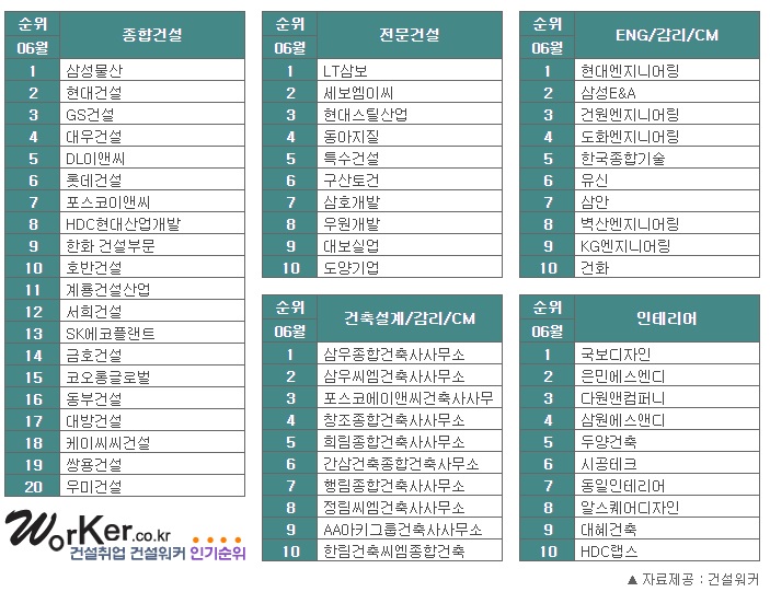 📝 "내가 제일 잘 나가" 건설·건축·ENG·인테리어 순위 | 6월 건설워커랭킹