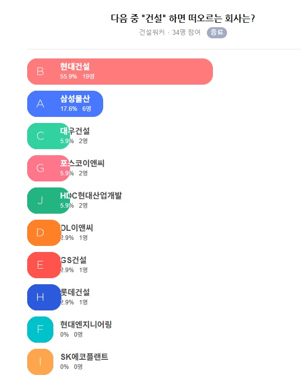 이번 투표는 참여 인원이 34명으로 많지는 않았지만, “건설” 하면 가장 먼저 떠오르는 회사로 현대건설이 꼽힌 결과에는 건설업계 종사자와 대중 모두가 공감할 만한 의미가 있습니다.