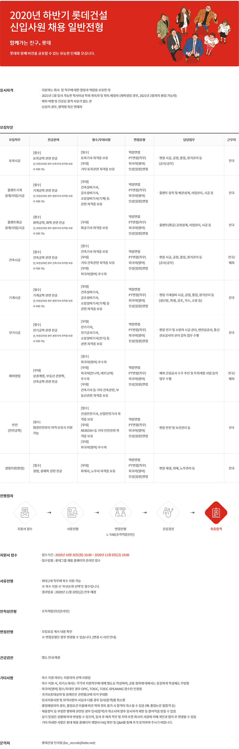 #건설워커 #단독채용속보 #롯데건설 #신입사원 #공개채용 #일반전형 #토목 #플랜트 #건축 #기계 #전기 #해외영업 #안전 #경영지원 #엘탭 #조직적합진단 #인적성검사