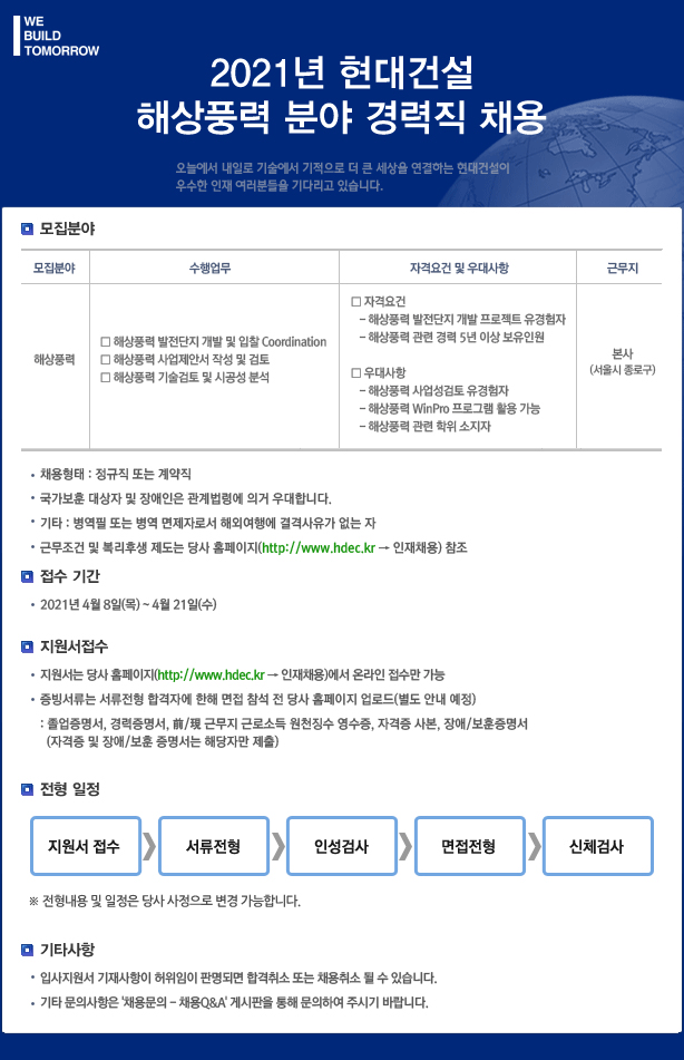 이상으로 건설워커가 현대건설 해상풍력 분야 경력사원 채용소식을 전해드렸습니다.