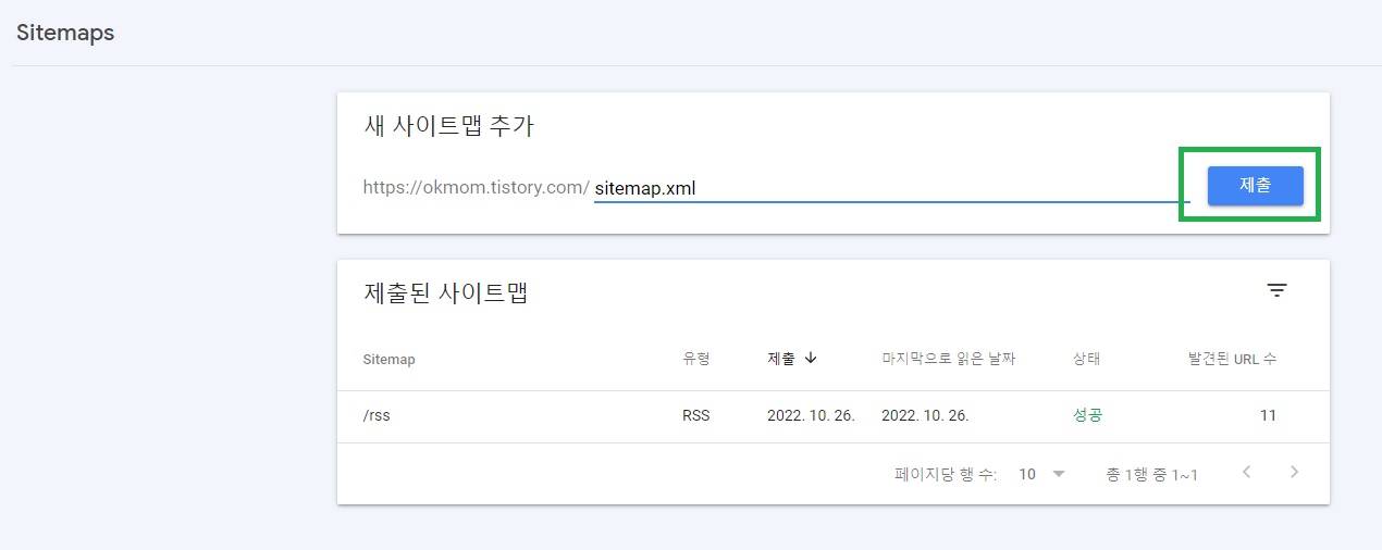 8) 새 사이트맵 추가 항목에서 sitemap.xml을 입력 > 제출 클릭