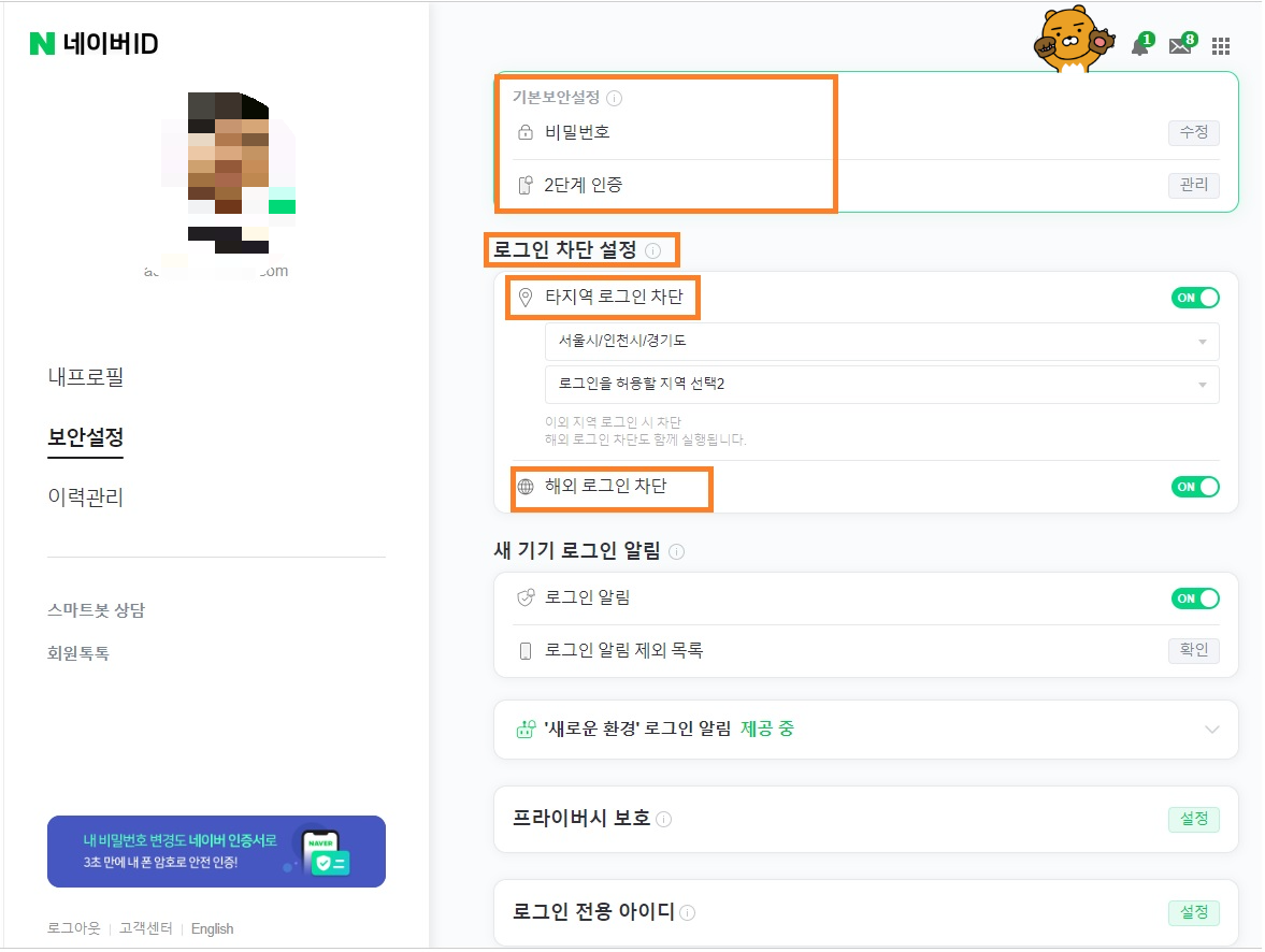 이미 해킹 메일 안내에 따라 아이디와 비밀번호를 입력했다면, 즉시 정상 절차로 로그인을 하여 비밀번호를 재변경하고, 2단계 인증관리 보안설정을 권유한다. 가급적 타지역 로그인 차단, 해외 로그인 차단도 설정 (아래 사진)