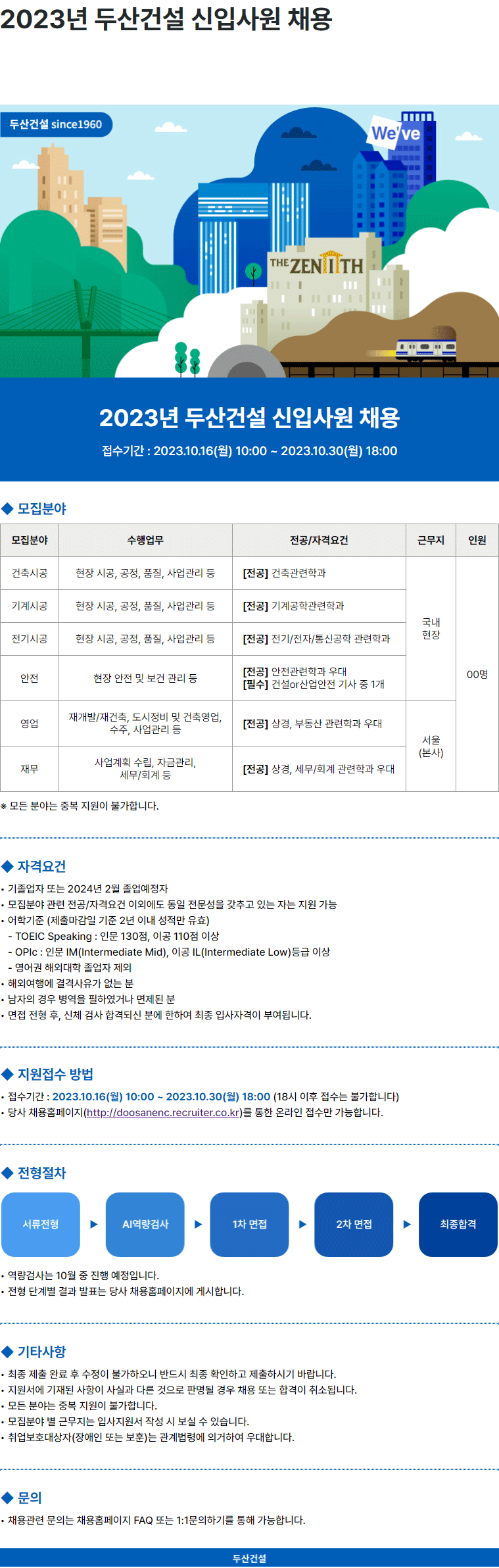 두산건설 since1960 2023년 두산건설 신입사원 채용 접수기간 : 2023.10.16(월) 10:00 ~ 2023.10.30(월) 18...
