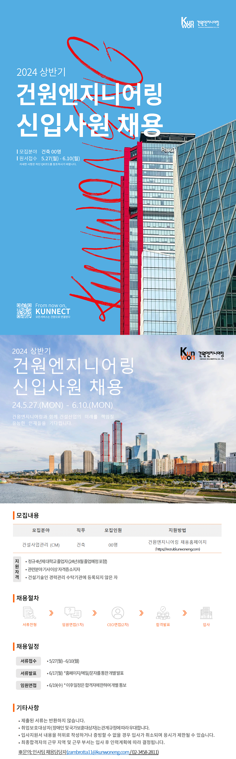 2024 상반기 건원엔지니어링 신입사원 채용 | 모집분야 건축 00명 | 원서접수 5.27(월)-6.10(월) 자세한 사...